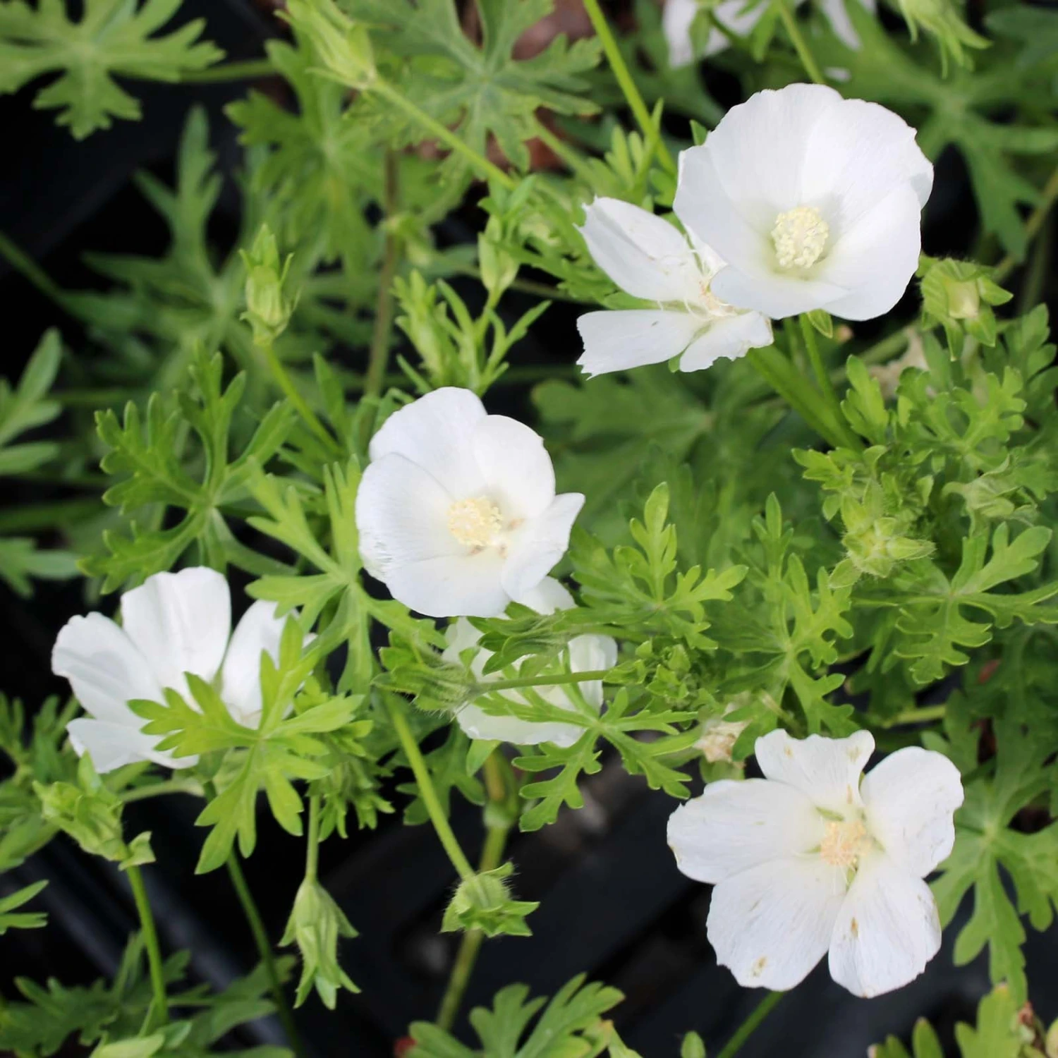 Callirhoe alcaeoides ‘Logan Calhoun’, commonly known as “Poppy Mallow”, is native to the central United States and is best suited to full sun with limited amounts of water. Its foliage is bright green and spreads across the grown in sprawling, slender stems that support a gorgeous display of large white flowers that lasts throughout the summer.