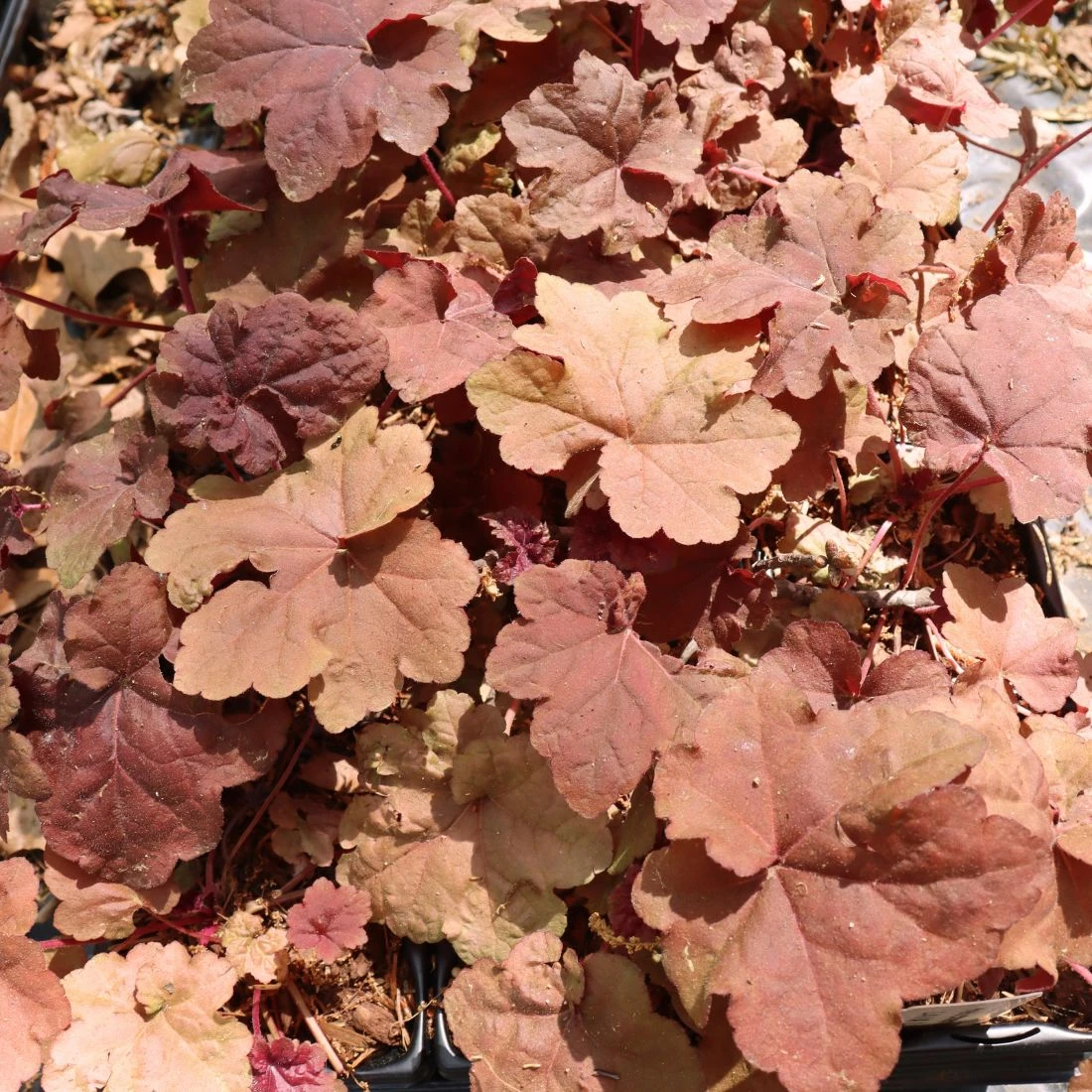 Heuchera ‘Lava Lamp’ has leaves that emerge copper-orange and deepen to purple with deep purple undersides as they age. Cream flowers bloom in early summer on deep purple scapes creating from beautiful contrast. Plant Patented.