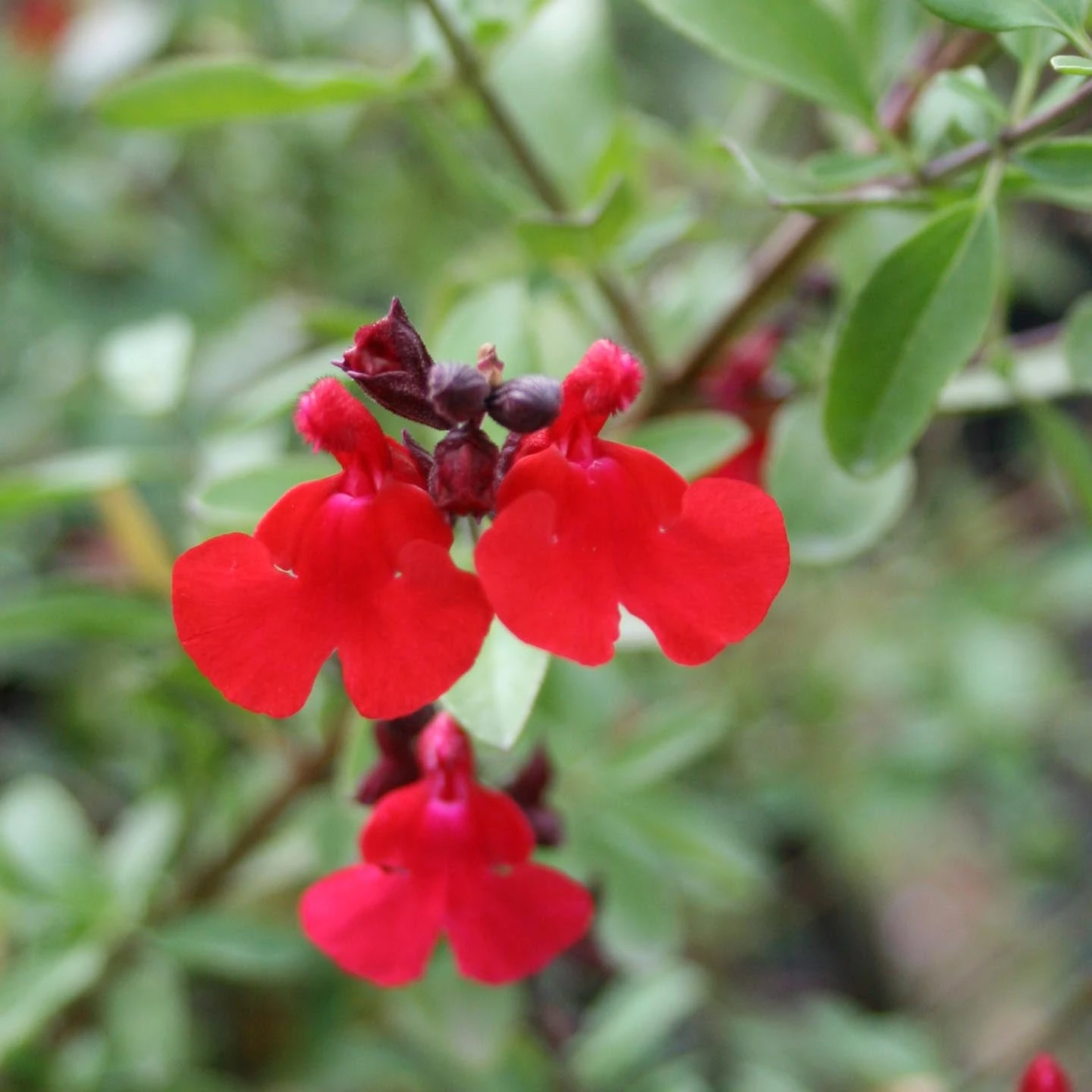 Salvia greggii ‘Flame’ is a semi-woody perennial that blooms from spring to fall with a brief pause in the hot, dry periods in the summer. Loaded with brilliant red blossoms and accented by dark green foliage, this plant likes full sun and can take part shade.
